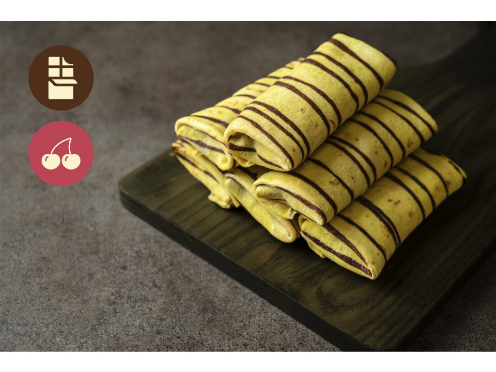 Měkké palačinky s čokoládovou náplní a kousky višní. Čokoláda přináší plnou sladkost, višně jemnou kyselinku, která celou chuť krásně zvýrazní. Po ohřevu je čokoláda měkčí a celkový dojem je příjemně dezertní. Skvělé pro milovníky sladkého.Doplňkové parametry